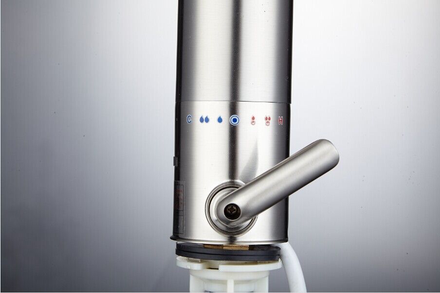 Durch die Einstellung des Bedienhebels nach hinten wird das Heizelement aktiviert und es fließt warmes Wasser. Diese Wasserarmatur funktioniert nach dem Prinzip eines Durchlauferhitzers, die Wassertemperatur wird durch die Menge des Wasserdurchflusses beeinflusst.